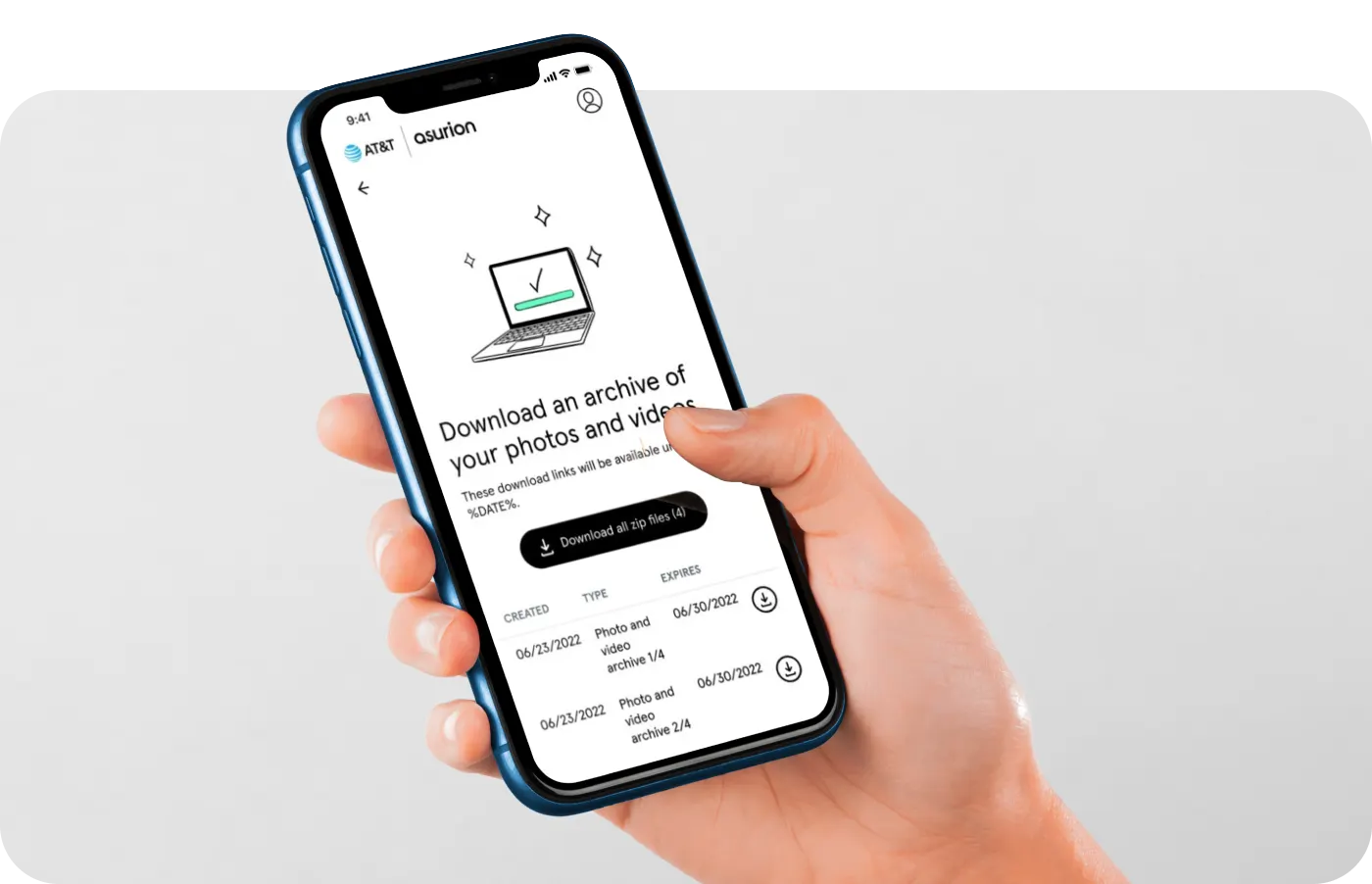 4. On the Downloads page, you’ll see a list of zip files with all your photos and videos. Each zip file can be up to 5 GB. Tap Download on each one to save it to your computer.